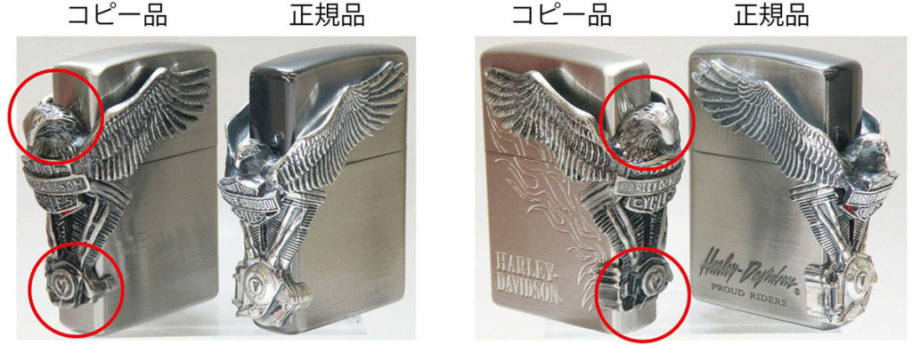 【注意】ハーレーダビッドソンZIPPOライターのコピー品が出回っています ハーレーダビッドソンZIPPOライターのコピー商品が、オークションサイト等で見受けられます。ご注意ください! 弊社ホームページに掲載のハーレーダビッドソンZIPPOライターは海外仕様は存在致しません。※海外仕様とはボトム(ライターの底部分)がへこんでいる商品です。 ご参考までに、下記比較画像のような商品がございます。