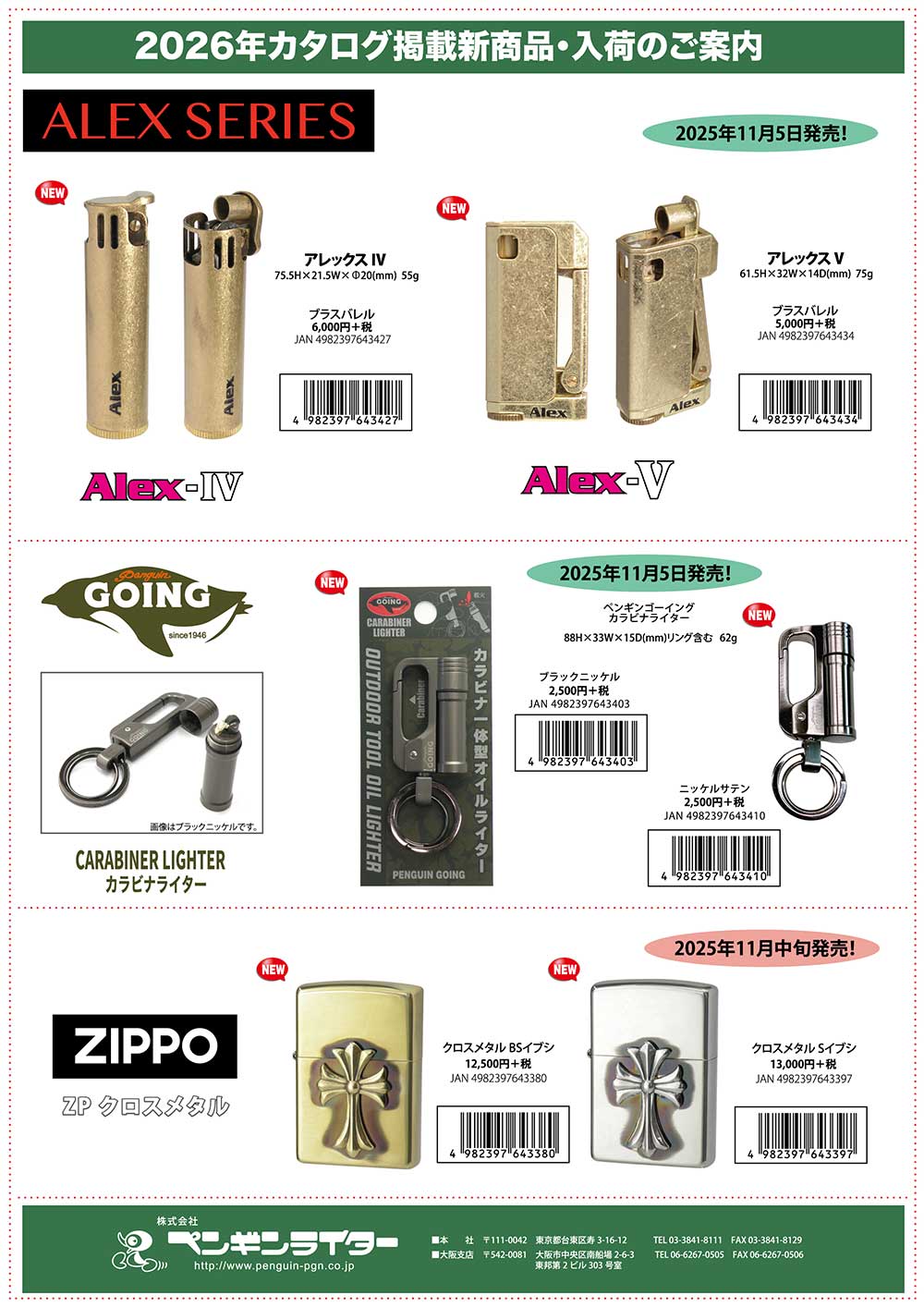 11月5日発売 GOINGカラビナ・ALEX4&5・ZPクロスメタル アレックス の一覧はこちら ZP クロス メタル の一覧はこちら 関連商品ZP クロスメタル SイブシZP クロスメタル BSイブシペンギンゴーイング カラビナライター ニッケルサテンペンギンゴーイング カラビナライター ブラックニッケルアレックスVアレックスIVAlex アレックス スリムオイルマッチ ブラスバレルAlex-Ⅲ アレックス-Ⅲ 卓上オイルライターアレックス トレンチライター ブラスバレルアレックス トレンチライター ブラスミラー