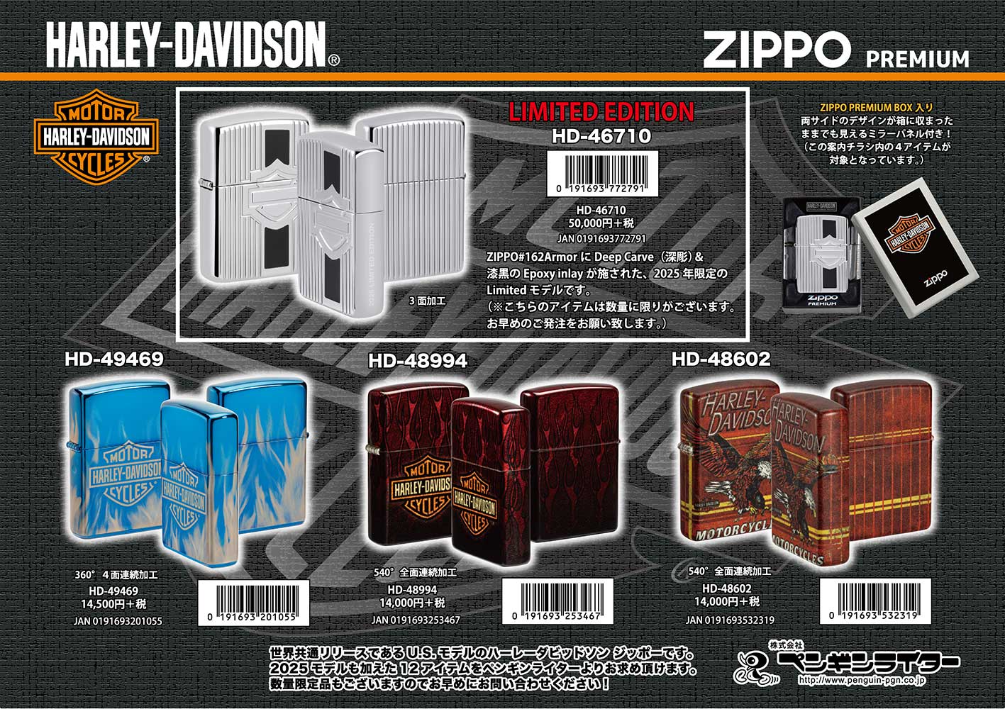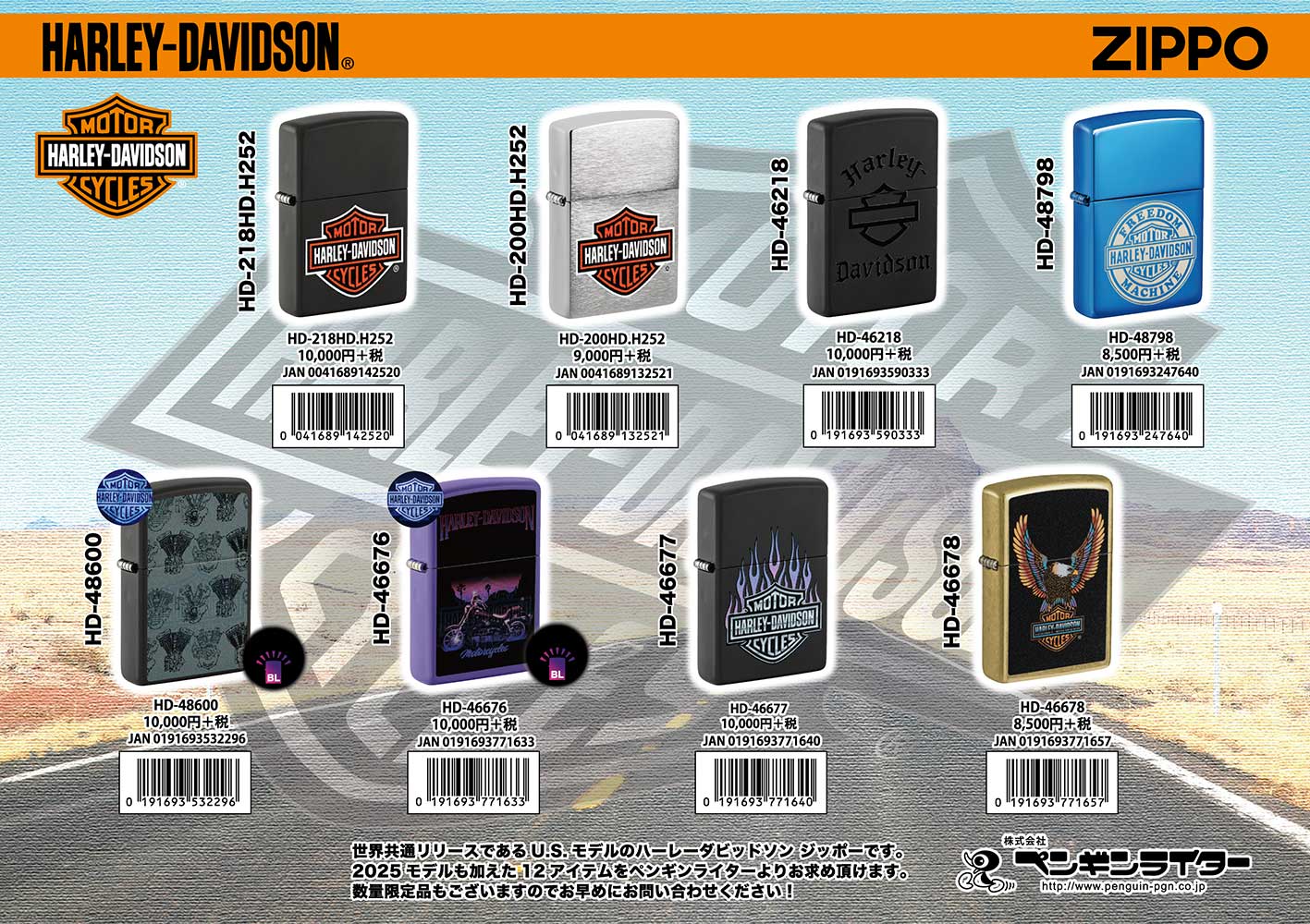 7月29日発売 ZIPPO HARLEY-DAVIDSON U.S.モデル 世界共通リリースであるU.S.モデルのハーレーダビッドソン ジッポーです。2025モデルも加えた12アイテムをペンギンライターよりお求め頂けます。数量限定品もございますのでお早めにお問い合わせください! HARLEY-DAVIDSONジッポー の一覧はこちら 関連商品ZIPPO HARLEY-DAVIDSON HD-46678ZIPPO HARLEY-DAVIDSON HD-46677ZIPPO HARLEY-DAVIDSON HD-46676ZIPPO HARLEY-DAVIDSON HD-48600ZIPPO HARLEY-DAVIDSON HD-48798ZIPPO HARLEY-DAVIDSON HD-46218ZIPPO HARLEY-DAVIDSON HD-200HD.H252ZIPPO HARLEY-DAVIDSON HD-218HD.H252ZIPPO HARLEY-DAVIDSON HD-48602ZIPPO HARLEY-DAVIDSON HD-48994ZIPPO HARLEY-DAVIDSON HD-49469ZIPPO HARLEY-DAVIDSON HD-46710 LIMITED EDITION