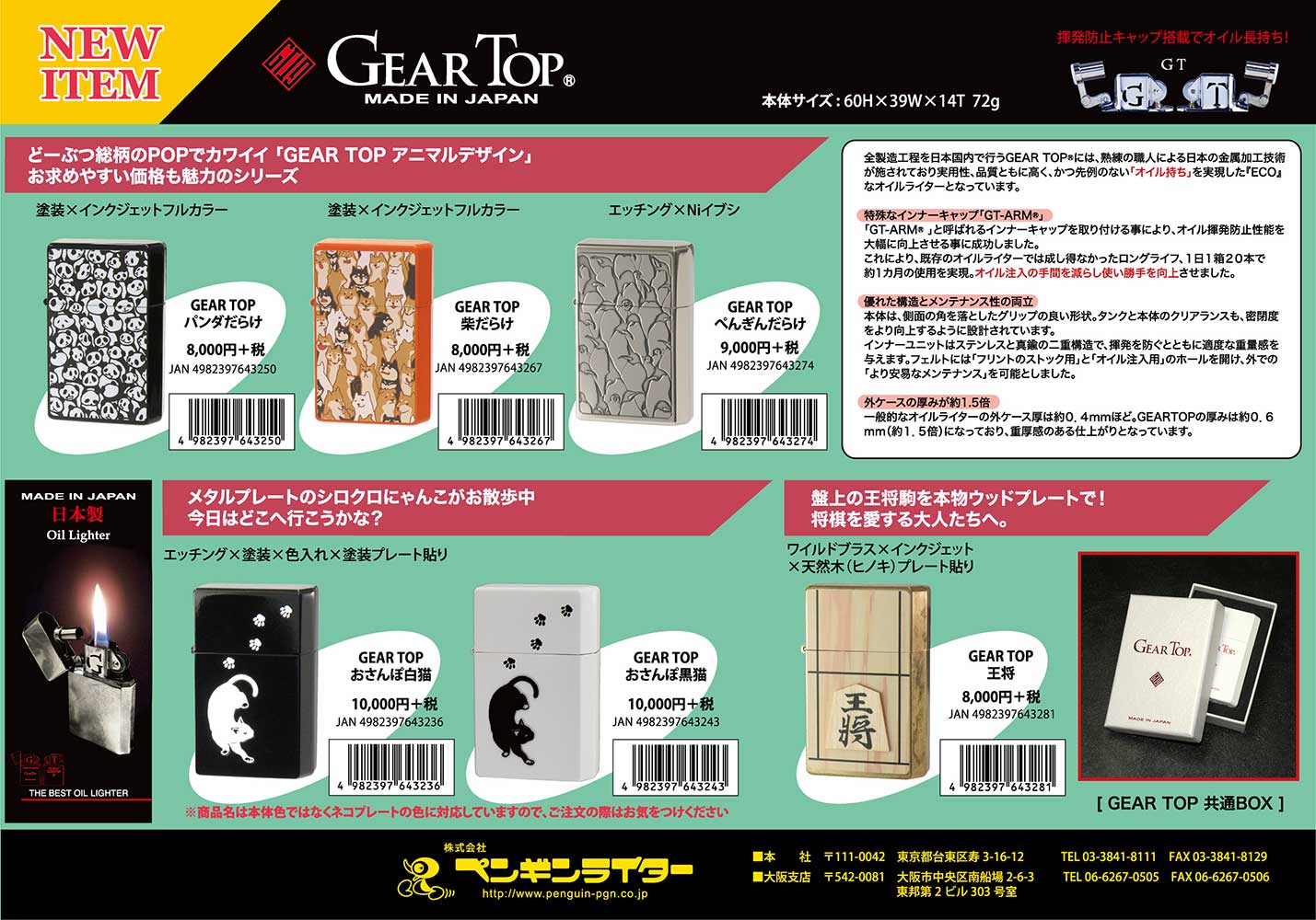 8月25日発売 GEAR TOP だらけシリーズ、おさんぽシリーズ、王将 だらけシリーズ どーぶつ総柄のPOPでカワイイ「GEAR TOP アニマルデザイン」。お求めやすい価格も魅力のシリーズです。 おさんぽシリーズ メタルプレートのシロクロにゃんこがお散歩中。今日はどこへ行こうかな? 王将 盤上の王将駒を本物ウッドプレートで!将棋を愛する大人たちへ。 GEAR TOP の一覧はこちら 関連商品GEAR TOP 王将GEAR TOP おさんぽ黒猫GEAR TOP おさんぽ白猫GEAR TOP ぺんぎんだらけGEAR TOP 柴だらけGEAR TOP パンダだらけ